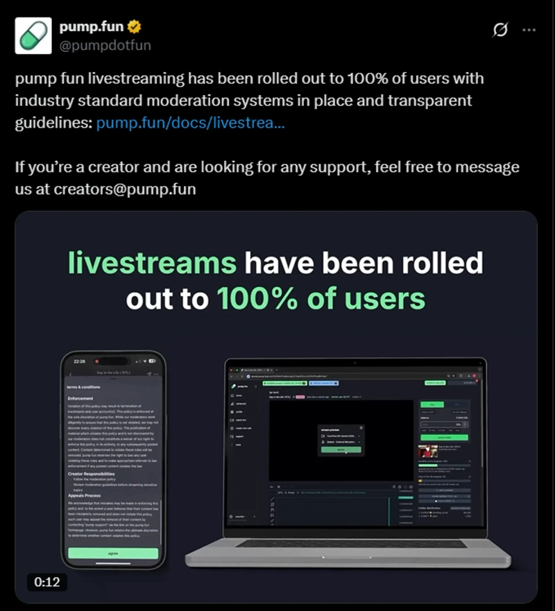 - Pump.fun, a Solana-based meme coin issuance platform, announced that it will provide live streaming services.