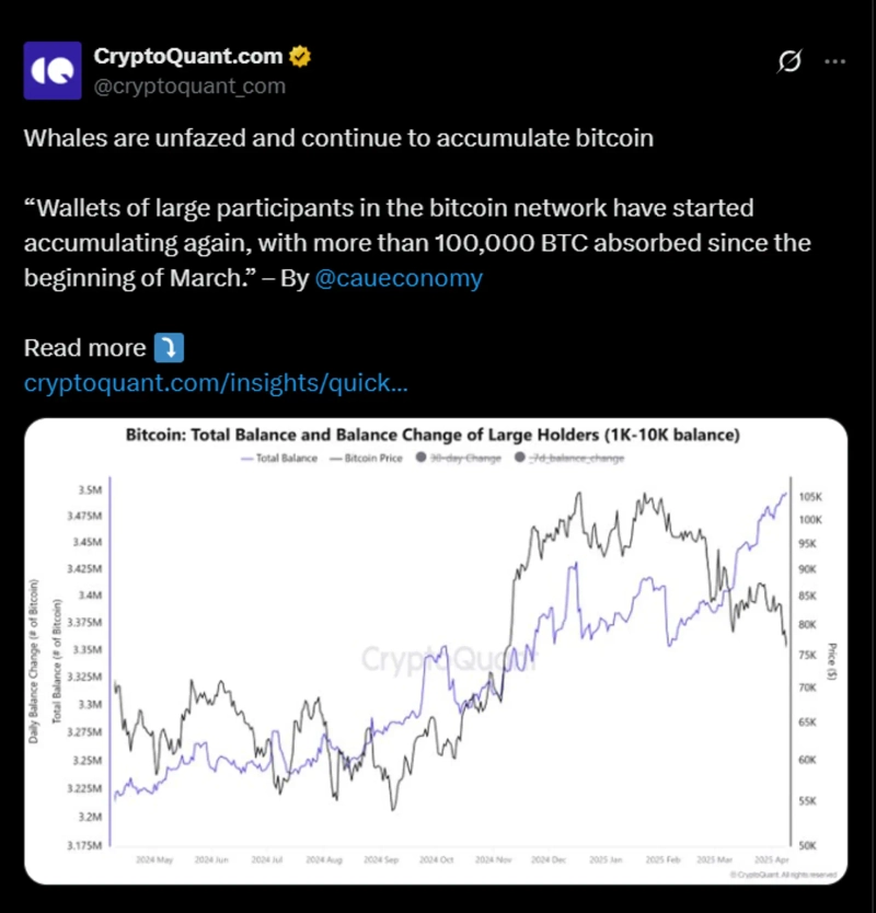It further stated, "Whale wallets on the Bitcoin network have resumed buying, with cumulative purchases exceeding 100,000 BTC since early March."