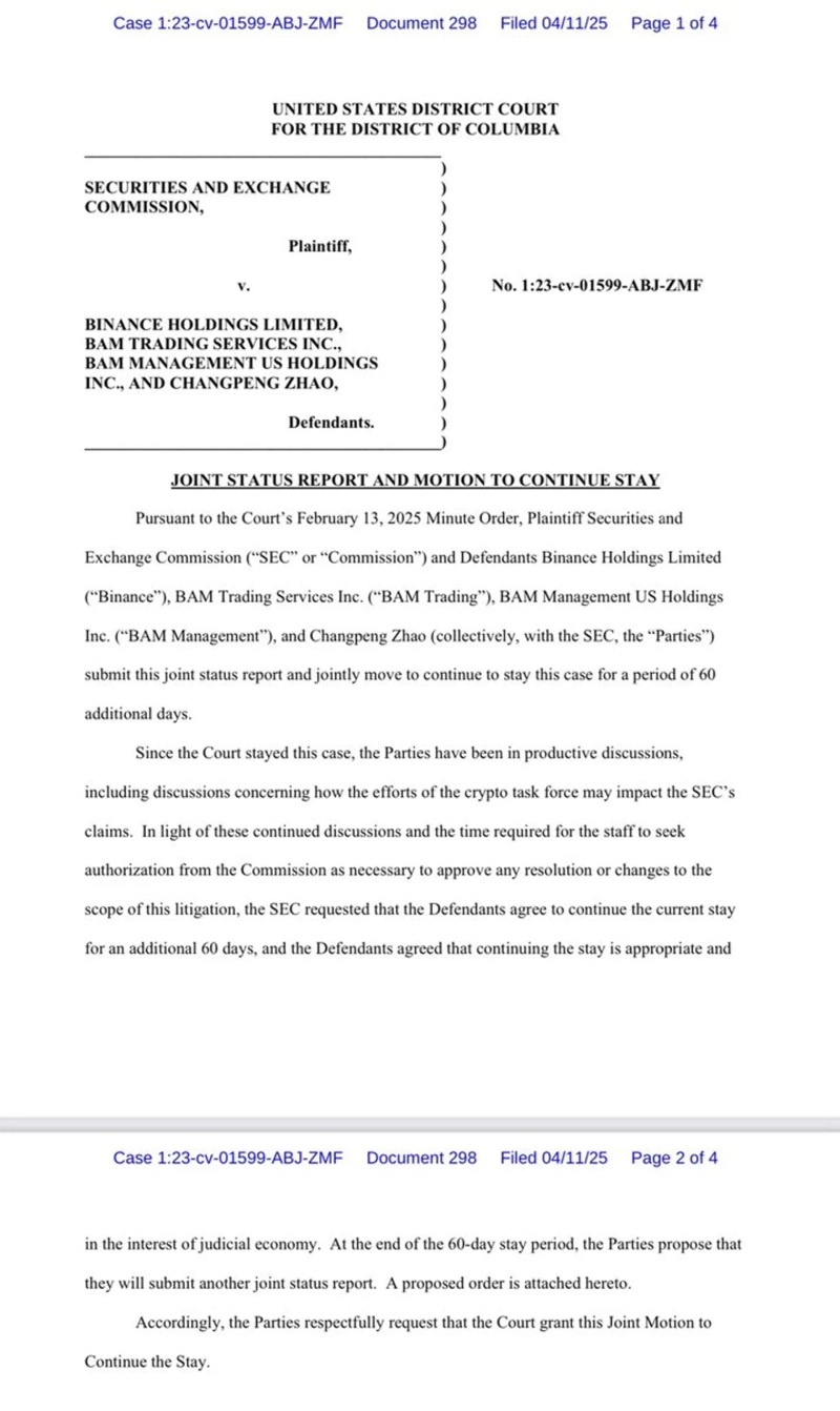 The U.S. Securities and Exchange Commission (SEC) and Binance have jointly requested the court to suspend the ongoing litigation for an additional 60 days.