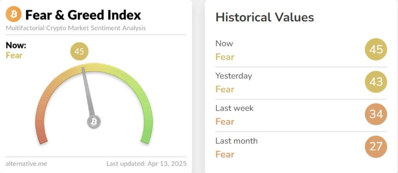 On the 13th (local time), the Fear and Greed Index provided by the virtual asset analysis company Alternative is currently at 45 out of 100, maintaining the 'Fear' stage. The index rose by 2 points compared to the previous day (43 points), suggesting a recovery in market sentiment.