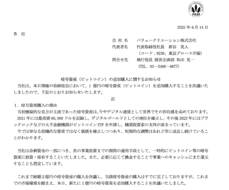 Previously, Value Creation also purchased Bitcoin worth 1 billion yen on March 17 and 31.