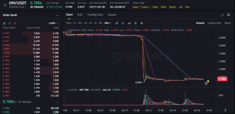 MANTRA also showed a sharp rise due to the CEO's efforts to restore trust. As of 3:33 PM, MANTRA is trading at $0.7886 on the Binance USDT market, up 27.94% from 24 hours ago. However, it remains significantly lower compared to the pre-crash price of $6.3.
