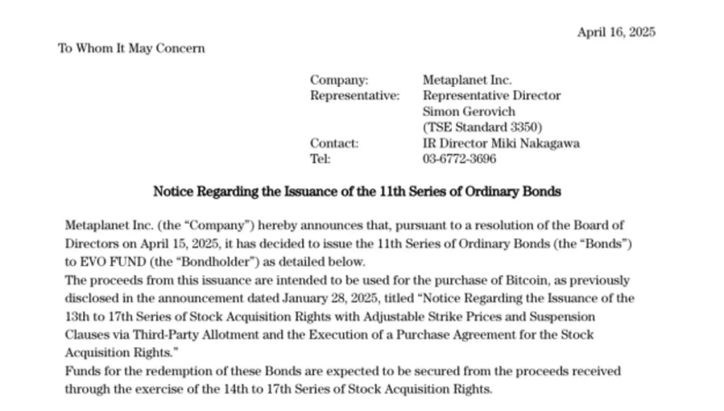 Japan's Metaplanet, regarded as a strategist, has issued bonds to purchase additional Bitcoin (BTC).