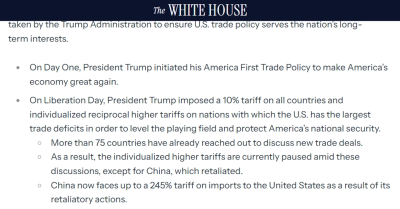 On the 15th (local time), the White House stated on its official website, "China faces import tariffs up to 245% as a result of retaliatory actions."