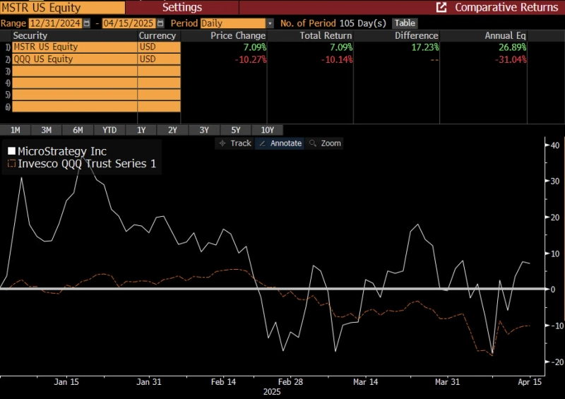 On the 16th (local time), Eric Balchunas, a Bloomberg ETF analyst, stated on X (formerly Twitter), "The U.S. tech stock ETF QQQ has fallen by 10% year-to-date, but Strategy has risen by 7%. This was completely unexpected," and added, "It's also surprising that Bitcoin is still at $85,000."