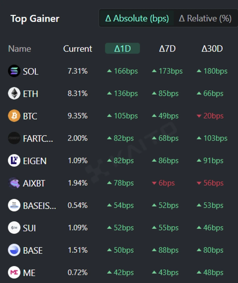 According to the Token Mindshare (a metric quantifying the influence of specific tokens in the cryptocurrency market) top gainers from the AI-based Web3 search platform Kaito, the top 5 cryptocurrencies currently attracting the most interest are Solana (SOL), Ethereum (ETH), Bitcoin (BTC), Fartcoin (FARTCOIN), and Eigenlayer (EIGEN).