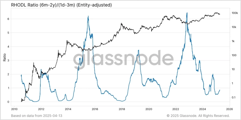 On the 18th (local time), Glassnode stated on X (formerly Twitter), "The Bitcoin RHODL ratio has risen above 0.2, doubling from 0.1 in February," adding, "This is a signal that the speculative sentiment of short-term holders is weakening, and the accumulation movement of mid-term holders is strengthening." The RHODL ratio is an indicator that considers the realized value between short-term and mid-term holders to determine market overheating.