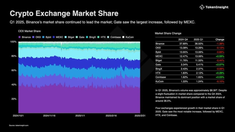 - The global virtual asset exchange Binance reported a slight decrease in market share to 36.5% in the first quarter but still maintains its top position.