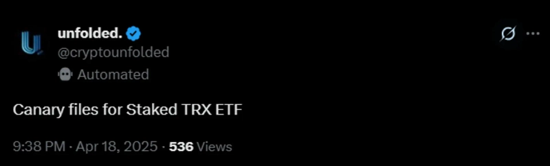 According to the virtual asset (cryptocurrency) analysis platform Unfolded on the 18th (local time), the virtual asset investment firm Canary Capital has submitted an application to the regulatory authorities for a Staked TRON(TRX) ETF.