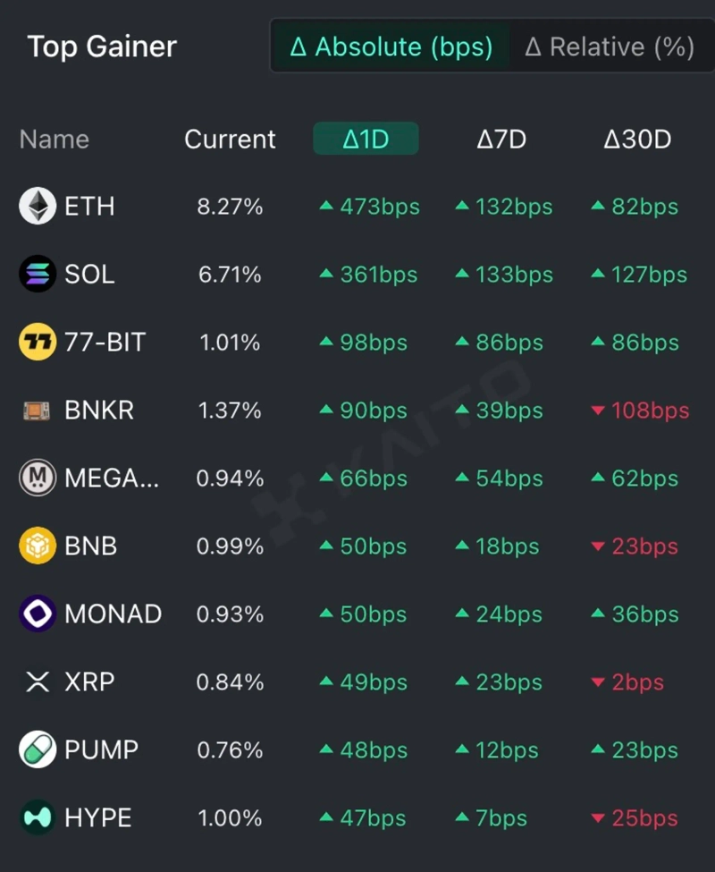 According to the top gainer of the Token Mindshare (a metric quantifying the influence of specific tokens in the virtual asset market) by the AI-based Web3 search platform Kaito, the top 5 virtual assets that people are most interested in as of the 19th are Ethereum (ETH), Solana (SOL), 77-BIT, Banker Coin (BNKR), and Mega Ether (MEGA).