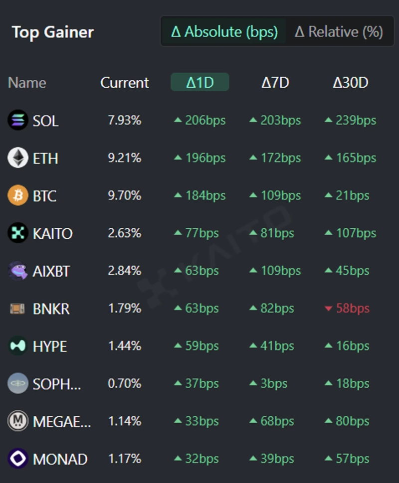 According to the Token Mindshare (a metric quantifying the influence of specific tokens in the virtual asset market) top gainer by the AI-based Web3 search platform Kaito, the top 5 virtual assets that people are most interested in as of the 20th are Solana (SOL), Ethereum (ETH), Bitcoin (BTC), Kaito (KAITO), and AIXBT (AIXBT).