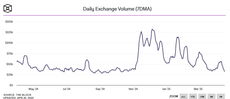 According to the data, the 7-day moving average trading volume of exchanges such as Binance, Coinbase, and Bitfinex was only $32 billion on the 19th. This is the lowest level since mid-October 2024 and represents a sharp decline of about 75% compared to early December (132 billion dollars).