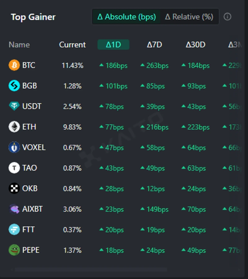 According to the Token Mindshare (a metric quantifying the influence of specific tokens in the virtual asset market) top gainers on the AI-based Web3 search platform Kaito, the top 5 virtual assets that people are most interested in as of the 21st are Bitcoin (BTC), Bitget Token (BGB), Tether (USDT), Ethereum (ETH), and Voxies (VOXEL).