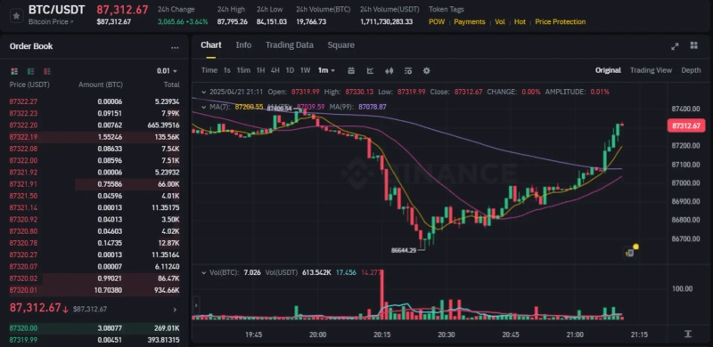 Following the news, Bitcoin, which had been slightly declining, rebounded. As of 9:11 PM, Bitcoin is trading at $87,312, up 3.64% compared to 24 hours ago on the Binance USDT market.