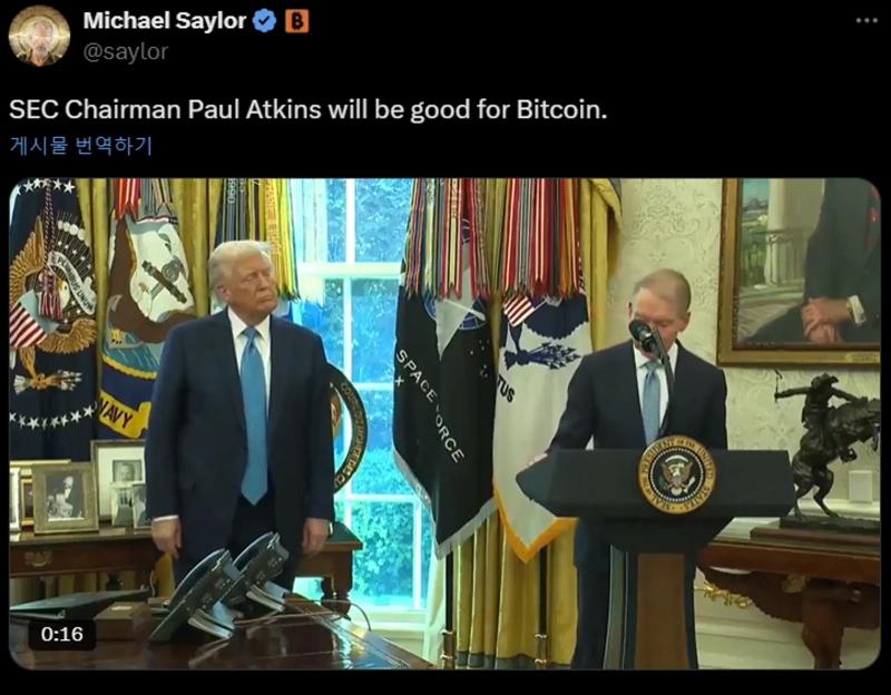 On the 22nd (local time), CEO Saylor stated via X (formerly Twitter) that "SEC Chairman Paul Atkins will have a positive impact on Bitcoin."