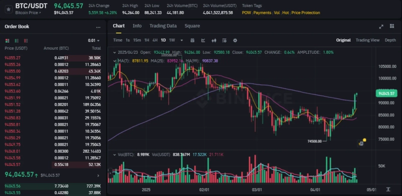 As of 4:59 PM (local time) on the 23rd, Bitcoin is trading at $94,045 on the Binance USDT market, up 6.28% from 24 hours ago.