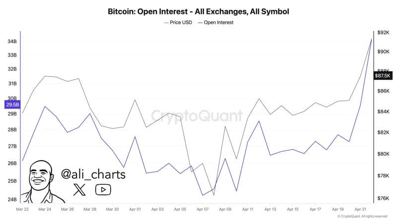 On the 23rd (local time), virtual asset analyst Ali Martinez stated on X (formerly Twitter) that "Bitcoin open interest has surpassed $34 billion, setting a new monthly high," and noted that "Bitcoin leverage fund inflows are increasing."