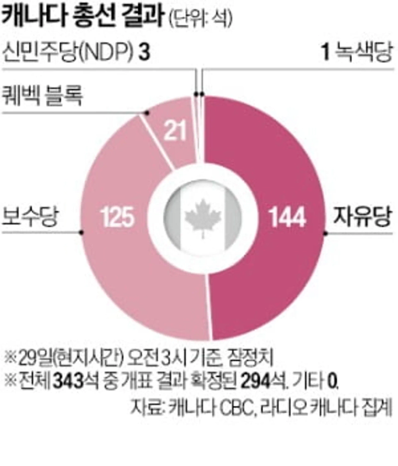'Anti-Trump' Canadian Liberal Party succeeds in re-election... "Ties with the US are over" According to Canadian public broadcaster CBC, the ruling Liberal Party secured 144 out of 343 seats in the Canadian general election, defeating the opposition Conservative Party (which secured 125 seats) to become the first party in the House. Thus, the Liberal Party succeeded in maintaining its position as the ruling party in the general election (fourth term). In Canada's parliamentary system, the leader of the ruling party becomes the prime minister, and no separate election is held. However, the Liberal Party failed to secure the status of a majority party with more than half of the seats (172 seats). Therefore, even if Prime Minister Carney takes office, it is expected that he will form a coalition with other minority parties or maintain cooperation practices.