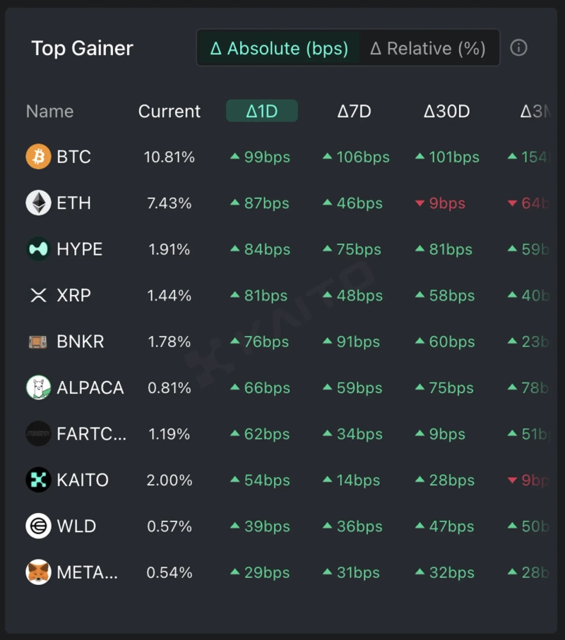 According to the Token Mindshare (a metric quantifying the influence of specific tokens in the virtual asset market) top gainers of the AI-based Web3 search platform Kaito, the top 5 virtual assets that people are most interested in as of the 1st are Bitcoin (BTC), Ethereum (ETH), HyperLiquid (HYPE), XRP (XRP), and Alpaca Finance (ALPACA).