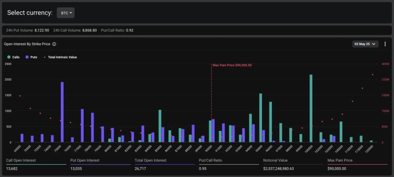 - The max pain price for Bitcoin options is $90,000, with an increase in call option buying above the $95,000 range.