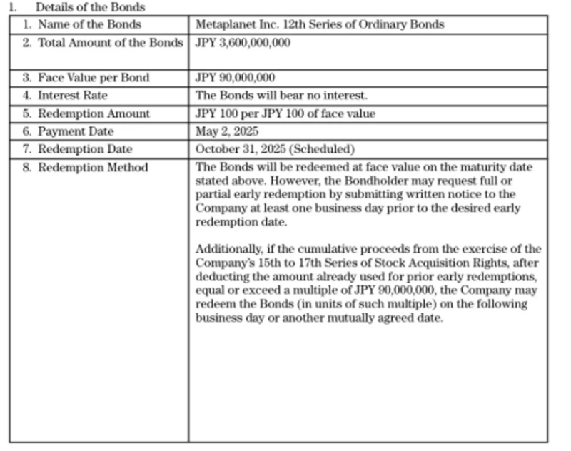 - The issuance, under zero-interest conditions, is expected to favorably contribute to Metaplanet's strategy to secure Bitcoin.