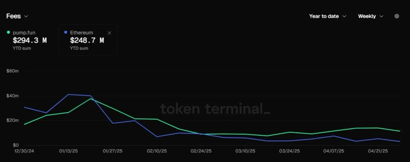 On the 5th (local time), WuBlockchain, citing Token Terminal data, reported that Pump.fun has earned $294 million in revenue so far this year. During the same period, Ethereum's fee revenue was only $249 million.