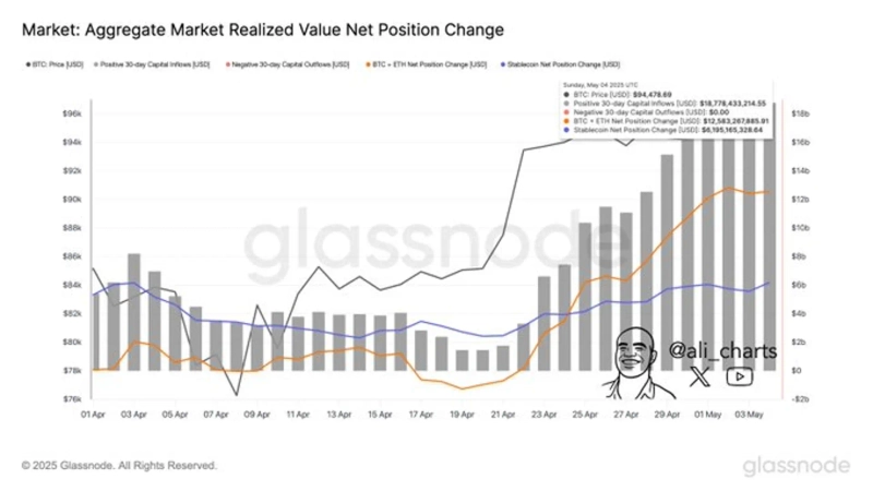 On the 5th (local time), virtual asset analyst Ali Martinez announced on X (formerly Twitter) that "$19 billion in capital has flowed into the market over the past 30 days."