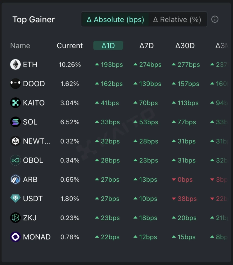 According to the top gainers on the Token Mindshare, an AI-based Web3 search platform Kaito, the top five cryptocurrencies that people are most interested in as of the 8th are Ethereum (ETH), Kaito (KAITO), Solana (SOL), Obol (OBOL), and Arbitrum (ARB).