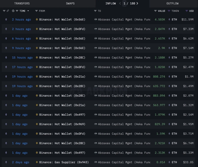 According to Lookonchain data on the 10th (local time), Abraxas Capital has withdrawn a total of 185,309 ETH (approximately $399 million) from exchanges over the past 3 days. During the same period, the price of Ethereum surged by 44% from $1,800 to $2,600.