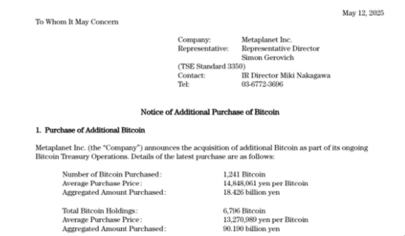 Japanese listed company Metaplanet announced on the 12th (local time) via X (formerly Twitter) that it has purchased an additional 1,241 Bitcoins (BTC). As a result, the total amount of Bitcoins held by Metaplanet has reached 6,796.