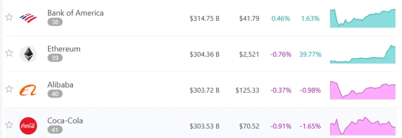 - Ethereum has surpassed Alibaba and Coca-Cola to rank 39th in global asset market cap.