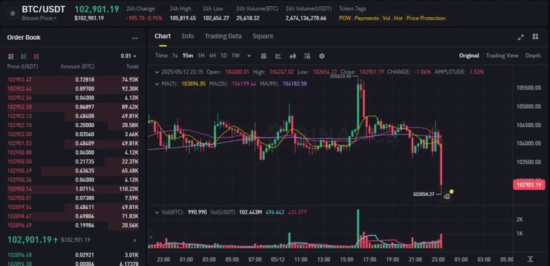 As of 11:29 PM, Bitcoin is trading at $102,901 on the Binance USDT market, down 0.95% from 24 hours ago.