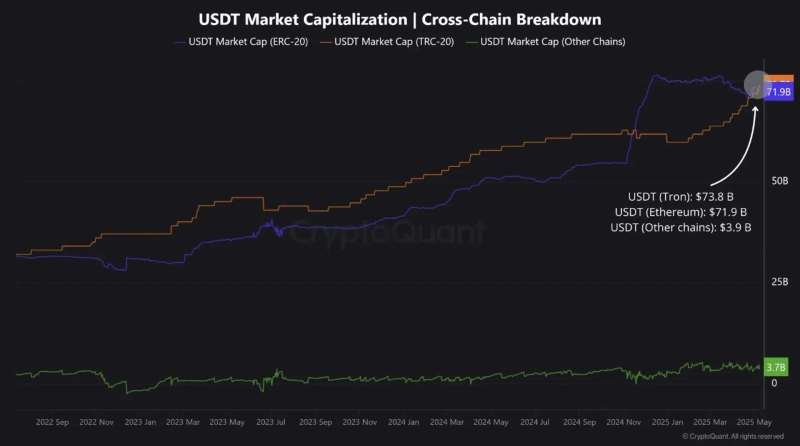 - CryptoQuant stated that the USDT supply on the TRON network is $73.8 billion, exceeding Ethereum.