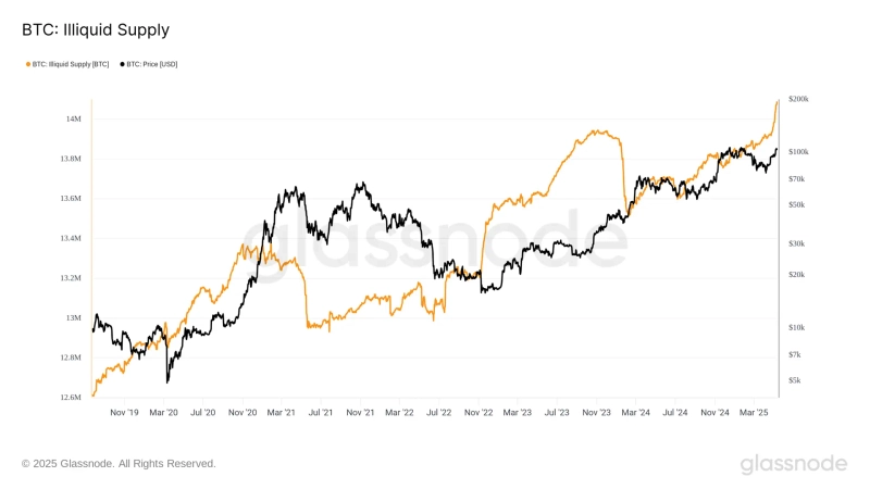 On the 13th (local time), Cointelegraph cited Glassnode data, stating, "The illiquid supply of Bitcoin has reached 14 million BTC, marking an all-time high." It further analyzed, "Whales and institutions are continuously accumulating Bitcoin."