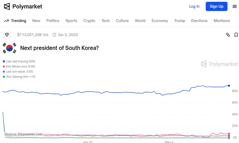 - In the decentralized prediction market, candidate Lee Jae-myung is leading with a 90% probability of winning.