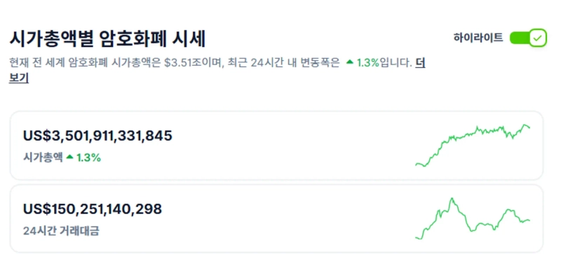 According to CoinGecko, as of 3:15 PM on the 14th (KST), the total market capitalization of the virtual asset market is $3.50019 trillion, an increase of 1.3% compared to the previous day.