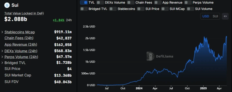 The locked-up value (TVL) of the Sui (SUI) network has surpassed $2 billion.