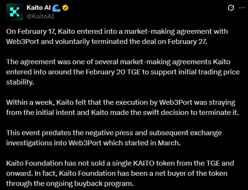 AI-based Web3 information platform Kaito announced on the 14th (local time) via X (formerly Twitter) that "Kaito signed a contract with market-making firm Web3Port on February 17, but voluntarily terminated it on February 27."