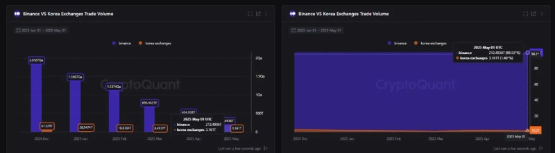 According to on-chain data analysis platform CryptoQuant on the 17th, Binance's global cryptocurrency trading volume share reached 98.53% as of May. In contrast, the combined trading volume share of domestic exchanges was only 1.46%.