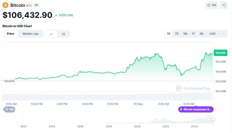 - Bitcoin is currently at $106,432, up 3.12% from the previous day, and is on the verge of breaking its all-time high.