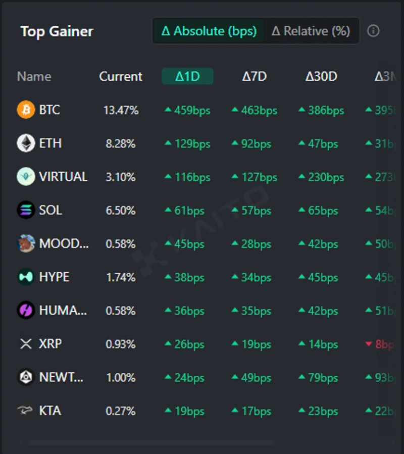 According to the top gainers on the Token Mindshare (a metric quantifying the influence of specific tokens in the virtual asset market) by the AI-based Web3 search platform Kaito, the top 5 virtual assets currently attracting the most interest as of the 19th are Bitcoin (BTC), Ethereum (ETH), Virtual Protocol (VIRTUAL), Solana (SOL), and Moodeng (MOODENG).