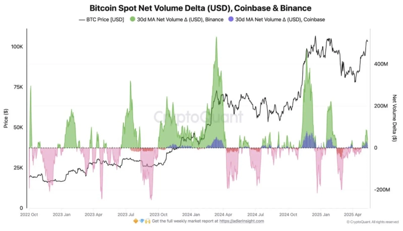 On the 19th (local time), a contributor to CryptoQuant's Dark Post reported, "Binance's Bitcoin spot net trading volume delta has turned positive again," indicating "a signal that buying activity in the spot market is becoming active again." The contributor added, "Although the Bitcoin price is over $100,000, the selling pressure has also significantly decreased," and stated, "The increase in volume in the current situation can be interpreted as a bullish sign."