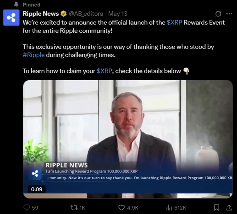On the 19th (local time), according to the cryptocurrency media outlet BeInCrypto, an account operating as 'Ripple News' on Ex posted a video about a '100 million XRP token reward program.' The video features a person resembling Brad Garlinghouse, the CEO of Ripple, announcing the reward program.
