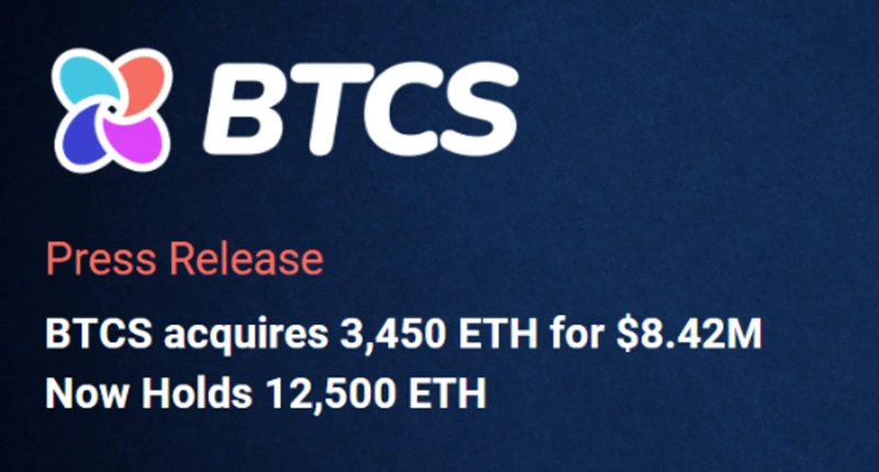 - Nasdaq-listed blockchain company BTCS announced that it has purchased an additional 3,450 Ethereum for $8.42 million.
