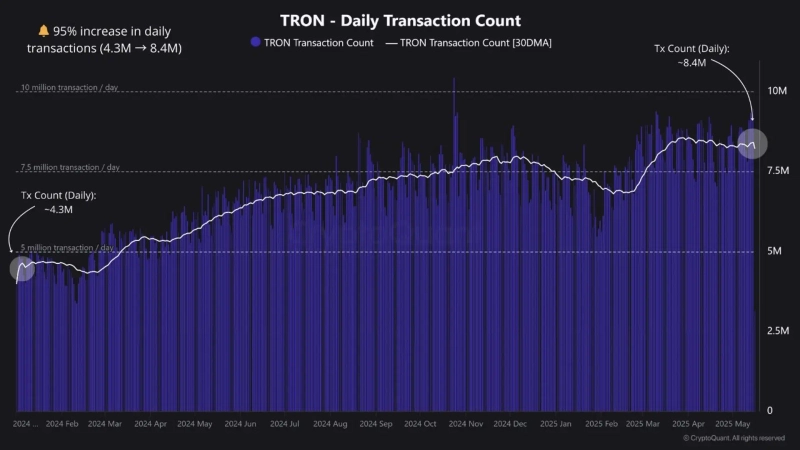 On the 21st (local time), Martun, a CryptoQuant analyst, reported that "the 30-day moving average of daily transactions on the TRON network increased by 95% from the beginning of last year to the middle of this year, reaching 8.4 million," and "this indicates that TRON network users are increasing in a stable and continuous trend."