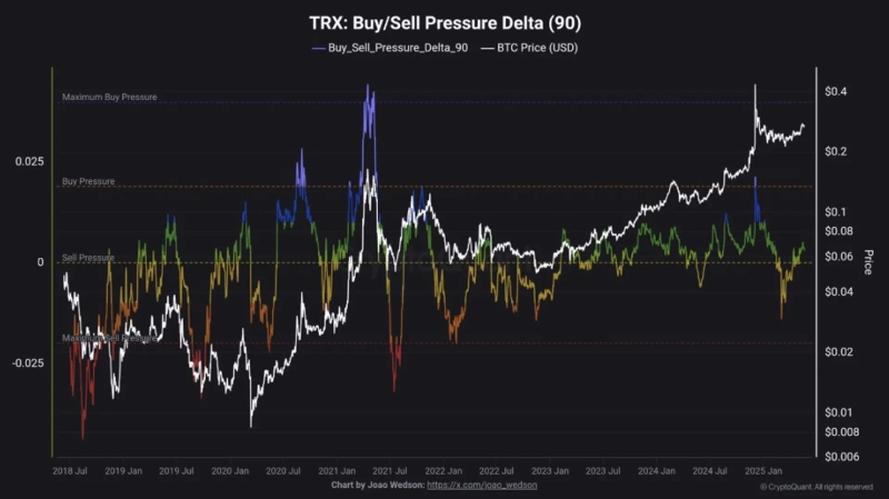 On the 24th (local time), Joao Wedson, a CryptoQuant analyst, stated in a report, "According to the Buy/Sell Pressure Delta indicator, the buying pressure for TRON has recently increased," adding, "The buying pressure has not reached its peak, so the bullish trend is still maintained." He further added, "There is still potential for further rise."