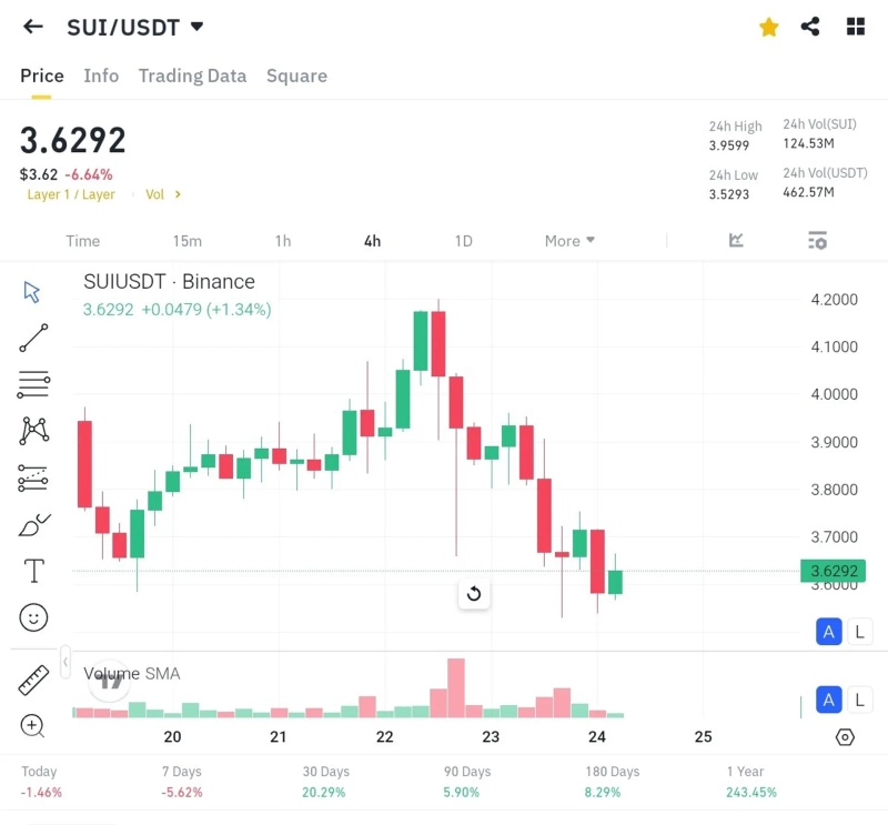 As of 9:59 PM, Sui is trading at $3.5378 on the Binance USDT market, down 3.48% from 24 hours ago.