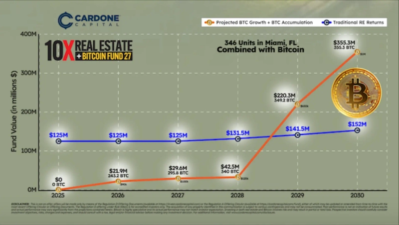 - The fund structure consists of 346 Miami real estate units and $15 million in Bitcoin.