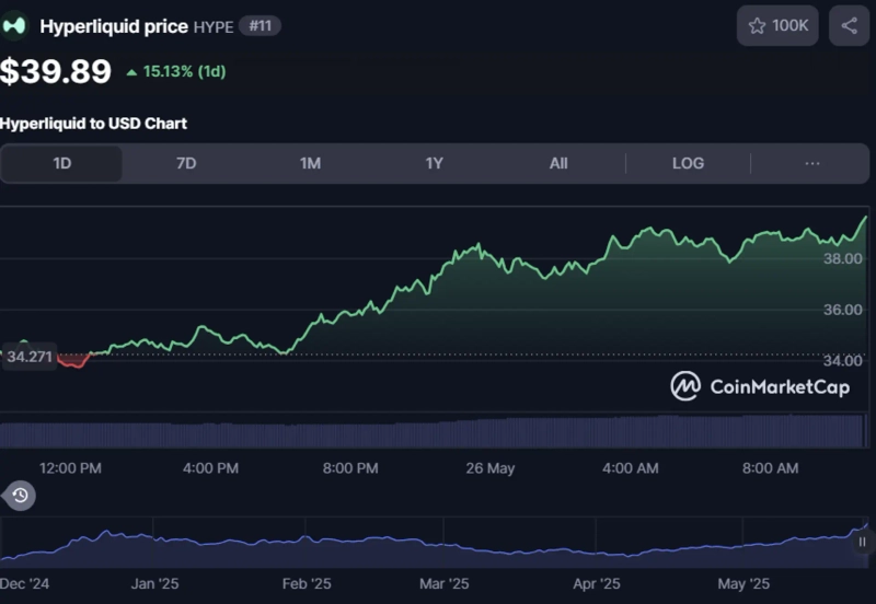 As of 10:47 AM on the 26th (KST), HyperLiquid is trading at $39.89, up 15.13% from the previous day according to CoinMarketCap.