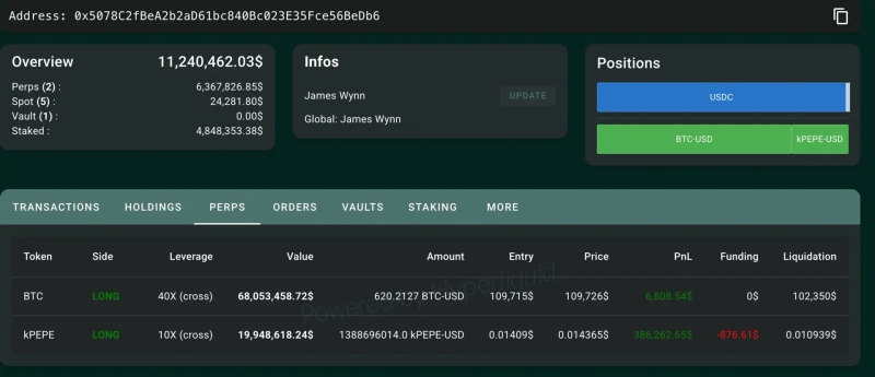 James Wynn, known as a whale on the decentralized futures exchange (DEX) Hyperliquid (HYPE), has reportedly taken a 40x long position in Bitcoin (BTC).